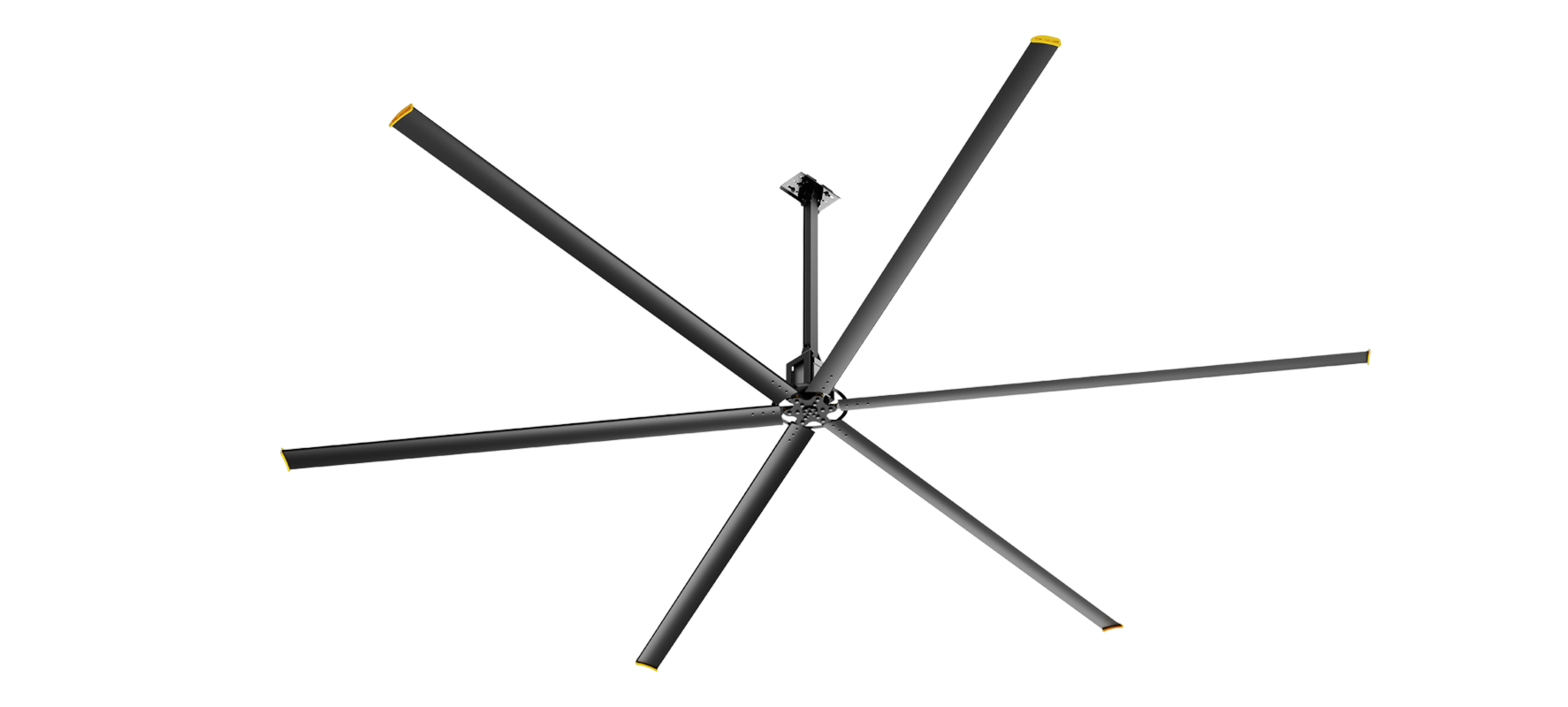 Caterpillar(CAT) 라이선스 라인업의 120"·168" HVLS(High-Volume Low-Speed) 실링팬으로, 넓은 개방 공간에서 완만한 대류로 냉감·환기 ...